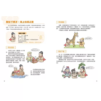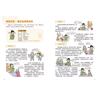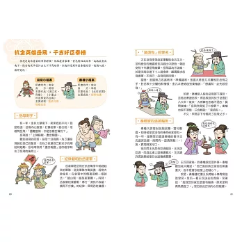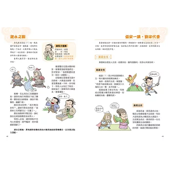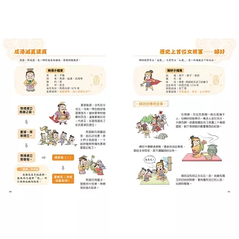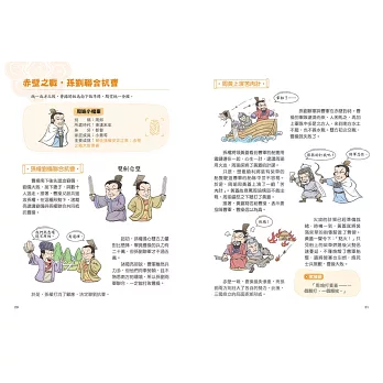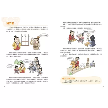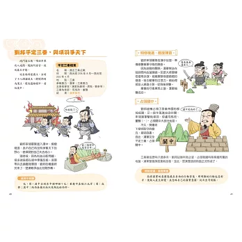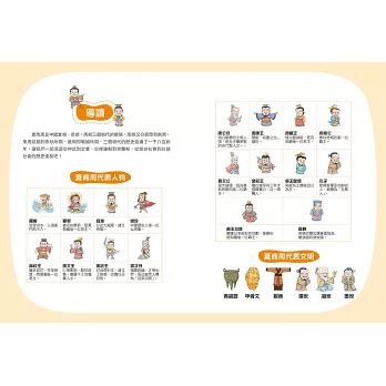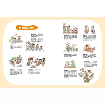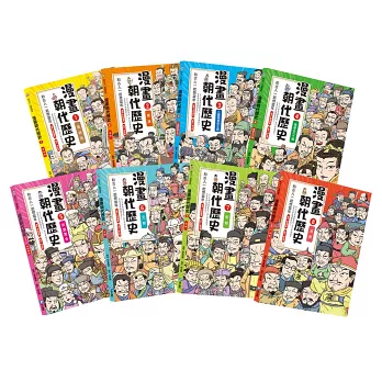 本套書共分八冊,將四千年的漫長歷史,以朝代交替、人物故事及重要事件清楚劃分章節,依照時間順序帶出紮實的歷史知識。內文將錯綜複雜的歷史故事以趣味的漫畫形式呈現,文字生動有趣、深入淺出且故事性強,講述朝代歷史精采又引人入勝,再複雜的情節也能簡單理解,輕鬆記憶。最特別的是,作者將古人們化為幽默逗趣的漫畫角色,每當有新人物登場,便會附上人物小檔案以及具有特色的漫畫形象,配上大量插圖與漫畫對白,讓人過目難忘,笑著笑著就讀懂歷史了!