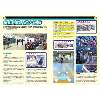 從台灣出發到詳細介紹釜山和大邱的移動方法,除金海機場和大邱機場前往市區的方式外,特別加入從首爾出發、搭乘火車或長途巴士前往兩地的交通。此外,釜山和大邱城市本身交通,以及前往近郊、甚至延伸其他順遊城市的移動,都有詳細解說,包括標明票價、車程,而各景點更有詳細的交通方式提供,一次掌握完整情報。
