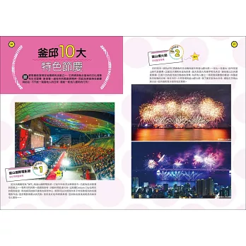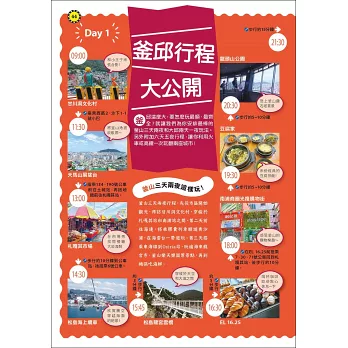 從釜山大邱最新景點、必吃的在地美食,到這兩座城市最不能錯過的節慶,甚至就連進超市該掃什麼貨,全都不藏私一一公開。此外,書中會以BOX方式介紹一些小知識或tips,例如:怎麼知道扇貝烤熟可以吃?或是前往海雲臺藍線公園該怎麼玩?要搭天空膠囊列車還是海岸列車?幫你解決旅途中的疑難雜症!
