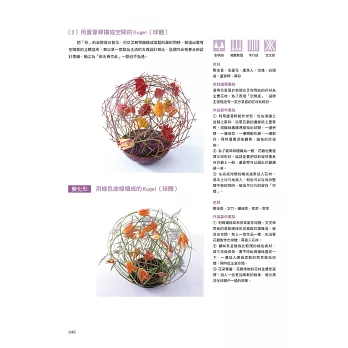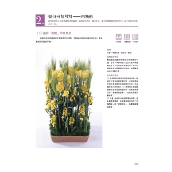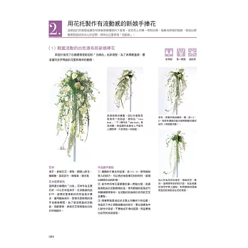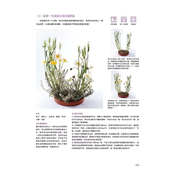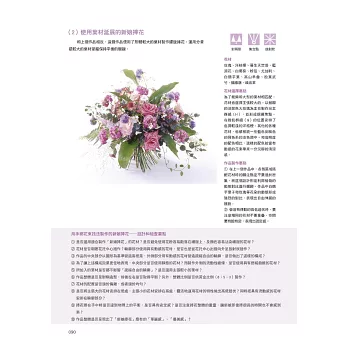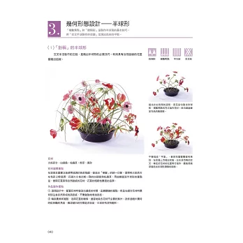 在下冊的內容中,以中高級的習花者為對象,提供了19個主題課程。同樣地就自然的表現及非自然的表現分別進行講解,並加入幾何形,流線形、手綁花束、新娘捧花等進階的作品概念。