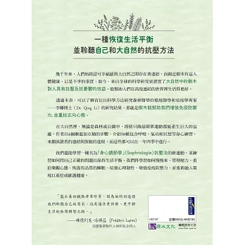 透過本書,可以了解首位以科學方法研究森林醫學的環境醫學和免疫學專家──李卿博士(Dr. Qing Li)的研究結果,那就是樹木能幫助我們保持健康、增強免疫防禦力,並重拾正向心態。