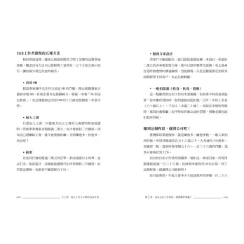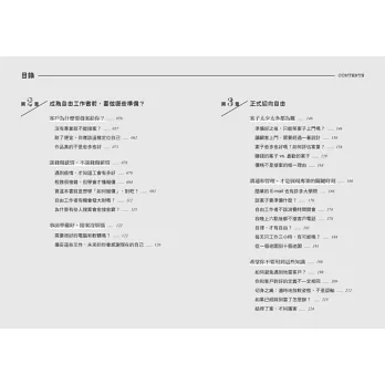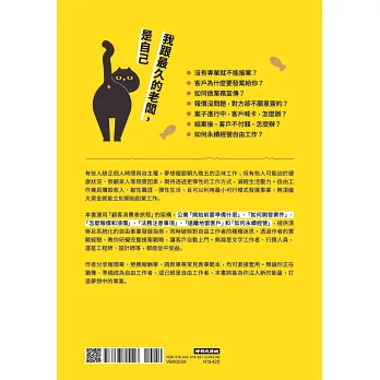 成為自由工作者後,開發客戶的方法,與客戶溝通的注意事項,管理客戶的質與量、案件規模,甚至詳細到如何減少開會與各種工作訊息的干擾──當客戶頻繁用電話或訊息轟炸,你願意終止合作嗎?又該如何終止才好?並附十一種地雷案件警示燈,以及已經踩到地雷的拆除法──當和客戶發生衝突,在失敗的危機與壓力下,如何重振心情減少後續損害,找出雙贏方法(這段血淚經驗非讀不可)?