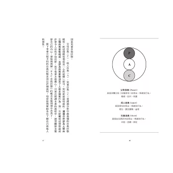 本書收錄溝通分析中最基本的概念「PAC自我狀態」「交流模式」與「撫慰」,並講述如何將這些觀念用於實際溝通。透過日常生活中頻繁發生的衝突、壓力等實際案例,幫助讀者更輕鬆地理解溝通分析,並運用在實際生活中。
