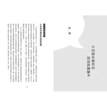 因此,比起說話的技巧,本書會更著重在影響說話與溝通的內在力量、溝通分析的理論以及可實際練習的範例等等。藉此培養內在的力量,並進行對外說話的訓練,這樣一來才能使讀者學會如何明確表達自己的意思,同時又能有彈性地與他人溝通。