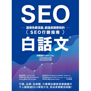 「Frank 的 SEO 白話文在網路上早已是眾多 SEO 學習者必看的網站,現在他花了一年多的時間將知識整理成書,勢必是你實體書架或電子書架必備書籍」——網路行銷老師的老師 邱煜庭(邱小黑)