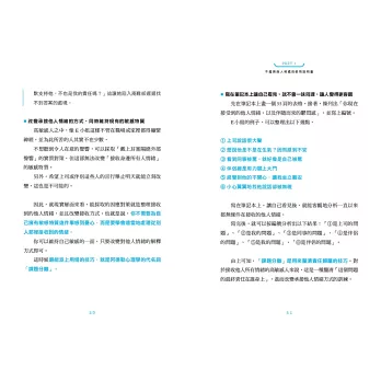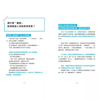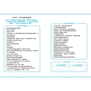 本書以正向積極、溫柔理解的筆法,娓娓道出高敏感人的生活糾結。同時運用心理學上的專業技巧,提供大量練習、表格及案例說明,讓高敏感人一書在手,猶如拿到一本實用的使用手冊。隨書更附贈為高敏感人量身打造的「HSP練習」,你可以按圖索驥,在無負擔的操作中更了解自己,並懂得將高敏感轉換成自身優勢,活得更輕鬆、更自在!