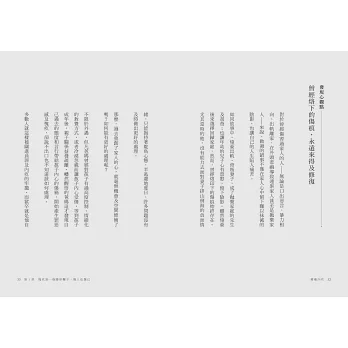覺得自己做得不夠多、不夠好的姊姊;總是要麻煩家人照顧自己的弟弟;長期處於「如果當初⋯⋯就好了」罪疚感的母親;心中無力想遺棄兒子、同時感到自責的父親⋯⋯全書觸及因教養、長照、背叛、拋棄等引發的內疚議題,輪番呈現每個當事人的心路歷程,補足不同的視角及觀點,看見內疚感如何流動於人際之間、產生影響。