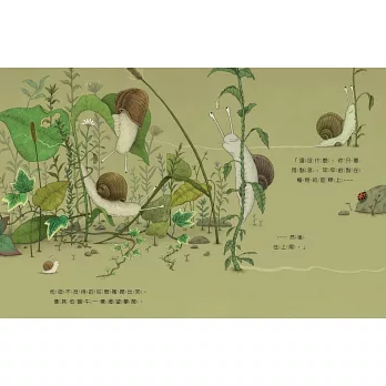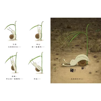 小蝸牛亨利好想和其他蝸牛一樣,可以向上攀爬,爬到植物莖稈的頂端,但是天生就沒有黏液的他,無法附著在植物的莖稈上,也無法攀高;他只能沿著地面爬行。