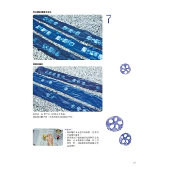 染色技法方面,從最簡單的浸染到刷染、絞染、蠟染、拔染、夾染都有示範,其中以橡皮筋代替針縫來綁紮絞染的技法,是最適合與小朋友一起玩染色的。