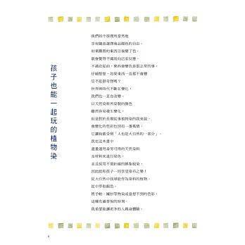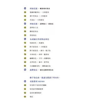 書末還附有重點整理,將煩瑣的染色原理條列說明,一目了然,讓您實務與理論兼具。最後,就讓我們親自動手體驗天然植物染的樂趣吧!