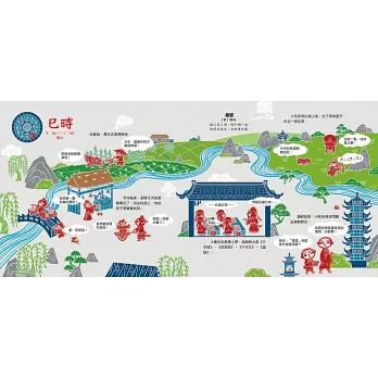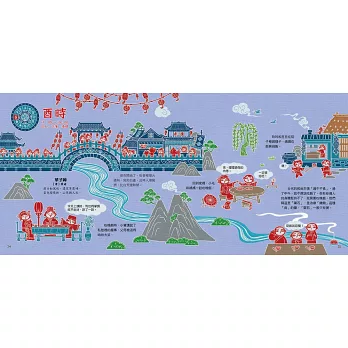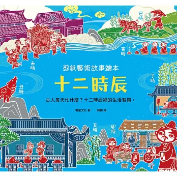 本書依照十二個時辰的順序說故事,讓你透內容及精緻的剪紙插圖,了解古人的一天在做什麼。書中可以看到古代宋朝的城市(汴京)和鄉村在一天中各個時辰的景象,還有幾個年紀差不多大的孩童,他們有著不同的身分,每天的經歷都不太一樣,快去看看有什麼好玩的事吧!