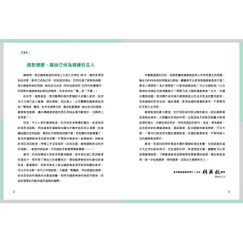 最後,我感到很榮幸寫這本關於健康檢查的新書,也很感謝幼福文化支持出版的想法,並且協助付梓,希望透過此書,讓讀者可以更認識健康檢查,了解健康檢查是健康管理最重要的基礎,藉由檢查結果,進一步促進健康、管理健康,成為自己健康的主人。