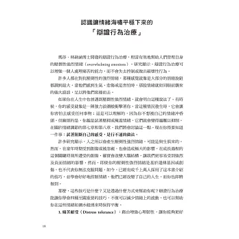 本書大部分的內容聚焦於培養足以改變人生的技巧,同時也教導如何全然徹底地接納自己的人生。書中介紹近五十種步驟技巧,有25年的臨床見證實效,幫助數十萬人重新生活,除了詳盡的引導說明、自我練習之外,亦搭配案例故事,讓你可以更容易理解如何將這些方法運用在生活中,為自己的強烈情緒找到出口,重新獲得和諧平穩的人生。