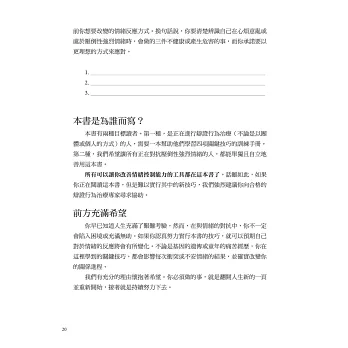 記住,自我改變需要時間和努力,而這本書將成為你的指南,幫助你走向一個更值得活的人生。——黃予岑 / 馬偕醫院自殺防治中心方案心理師、杏語心靈診所治療師