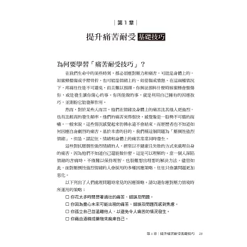 1.痛苦耐受:先從面對痛苦與強化對痛苦的耐受度開始,藉由增強心理韌性,讓你能夠更好地應對痛苦的情境,並為你提供幾個新的方法,讓你減緩身處困境時所帶來的各種影響。