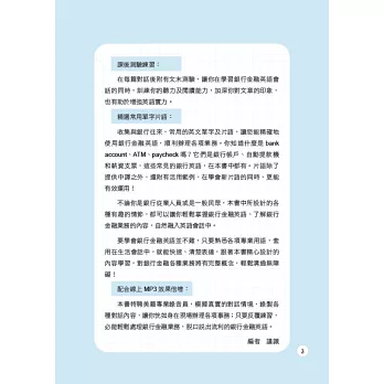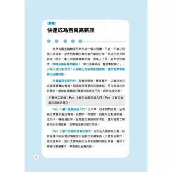 Part 1 銀行金融英語入門;Part 2 銀行金融英語會話應用。