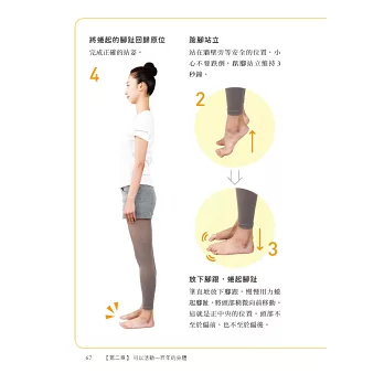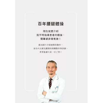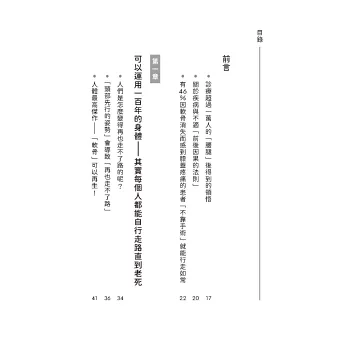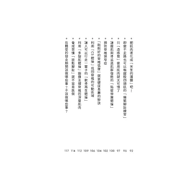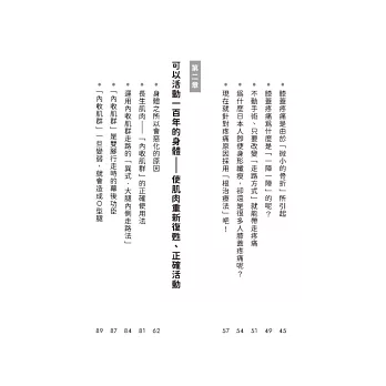 - 認識肌肉與筋膜,持續固定做這些動作,藉由擺位及姿勢運動改善骨盆(核心)、膝蓋、脊椎、足底,讓你的腳與腰變有力。à即使不走路也可以喚醒股四頭肌的「蜷緊腳趾練習」、養成習慣「放鬆腳趾」就不容易跌倒。