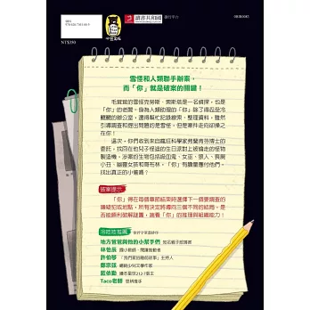 《雪怪偵探社1:消失的怪物製造機》的閱讀方式實在太特別了!辦案方向完全由自己決定,掌握劇情主導權的痛快讓人忍不住陷入其中、無法自拔!此外,故事中的角色大多非人類,卻都有著滿滿的人性,也因此他們所做的一切行為都令人格外有共鳴。推薦喜歡偵探推理小說的孩子或大人,都一定要讀讀這本書! ──夏美(熱愛推理小說的偵探媽)