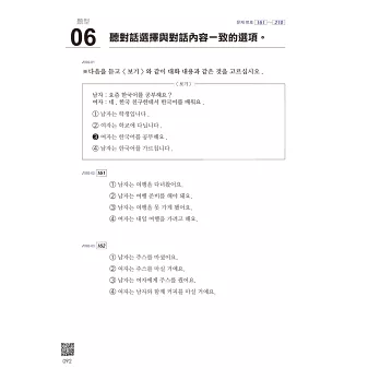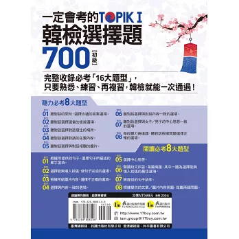 TOPIK I韓檢初級中,聽力&閱讀測驗合計共有16大題型,只要先熟悉題型,並練習完700題的大量選擇題,就能輕鬆上考場,一舉得高分!