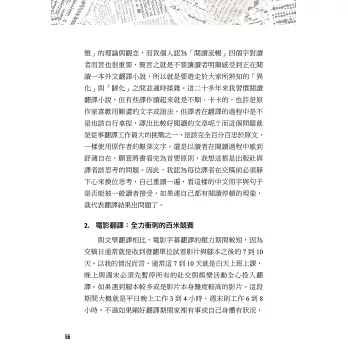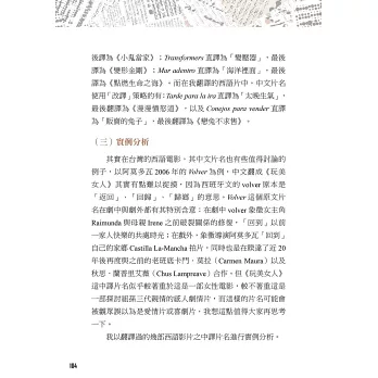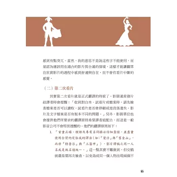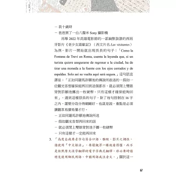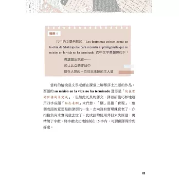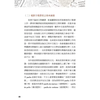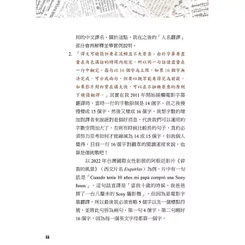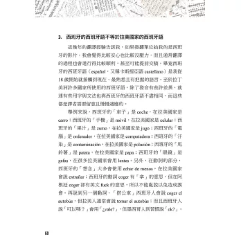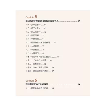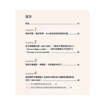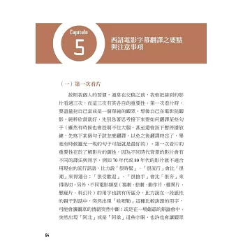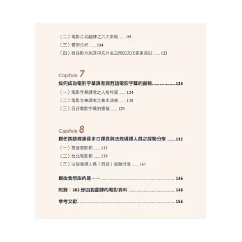 本書八大章節,作者從文學翻譯的經驗分享、102部的電影字幕翻譯經歷,一直到擔任西語導演來台參加映後座談的逐步口譯、法院通譯人員,這些實戰經驗躍然於紙上,就是要引領各種語言學習者,對外語翻譯的相關工作能有更深一層的認識。