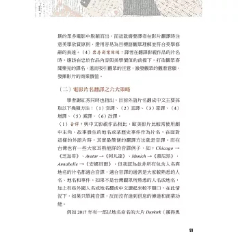 除了電影字幕翻譯之外,與電影內容息息相關的就是片名了。由於發稿單位可能會徵求譯者的意見,所以如何取一個既能幫助銷售又貼近內容的中文片名就非常重要了。作者提出四大功能及六大策略,逐項解析目前台灣所發行電影之中文片名取名眉角。