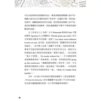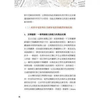 在海外讀書時期,作者從起心動念到實踐,主動踏出文學翻譯的一步,不但累積了筆譯的經驗,中間的種種過程,像是找出版社,或是分析、查找西班牙用語與拉美國家用語的不同等等,都成為日後翻譯拉美國家電影的基礎。
