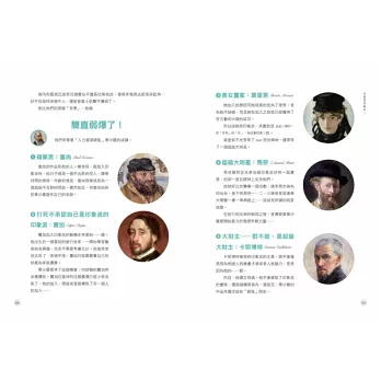 莫內和畢沙羅去戶外畫畫,一個因為太吵?一個因為太窮?雷諾瓦的名作,差點被日本收藏家燒掉?繪畫水準看起來不如小學生的塞尚,卻成了日後的現代藝術之父?竇加看似專畫優雅的芭蕾舞伶,其實是陰沉的舞女控宅男?家喻戶曉的瘋子畫家梵谷,其實命苦如中藥,命硬如鑽石?叛逆有才的富二代馬奈,是所有神人畫家的偶像?被男神包圍的唯一女神莫里索,有個顧爺超想分享的八卦?