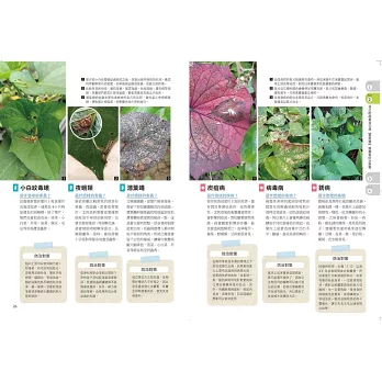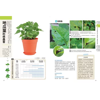 包括常見的地瓜葉、空心菜、青江菜、小白菜、芥藍、茼蒿、菠菜、高麗菜等等,這些短期就能收穫的葉菜類,在幼苗期很容易受到害蟲的大舉進攻,像是猿葉蟲、黃守瓜、蝸牛、蝗蟲、金花蟲、椿象等等,而生長期則容易罹患病毒病、炭疽病、銹病、葉斑病、細菌性斑點病等等。本書針對這些病蟲害發生時的狀態,完整分析是哪種蟲?哪種病菌?會出現哪些癥狀?如何做好防治等等,鉅細靡遺的講解,即使是新手,也能快速分辨出症狀、找出病因,做好最佳的防治。