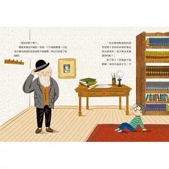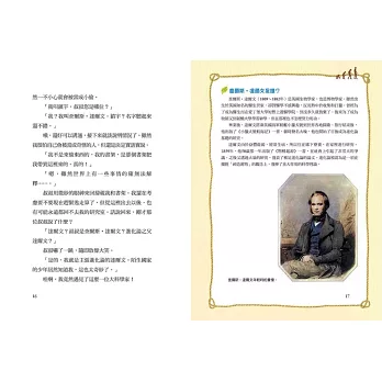 《達爾文的物競天擇》這本書以趣味橫生的方式,描述一個夢想成為科學家的少年鎮宇穿越時空和達爾文相會的故事。鎮宇從和藹親切的「達爾文叔叔」那裡聽到了關於小獵犬號航行的故事和獨特的實驗故事,不僅了解了進化的概念,也發現達爾文人性化的一面。與此同時,鎮宇也深有信心,只要自己能夠像達爾文一樣擁有創意、耐性和踏實的態度,就能成為一位優秀的科學家。
