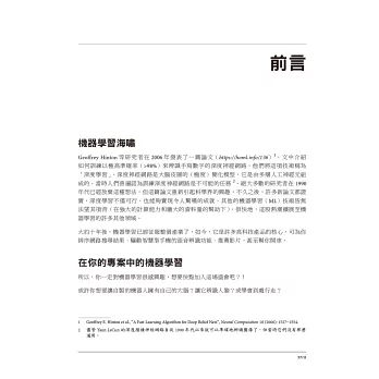 「本書是運用神經網路來解決問題的絕佳入門資源,涵蓋理論及實踐。推薦給想學習實用機器學習技術的人。」 —Pete Warden,TensorFlow行動主管