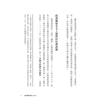 3.作者作為知中派的日本人,以親身經歷和在獄中時與中國高官的討論,分析中國政局及今後日本可致力的方向,也可看見日本在台灣問題中可扮演的角色。