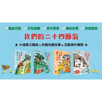 專為孩子設計的節氣百科繪本,結合立體、翻翻、推拉等多種互動小巧思,滿足孩子的好奇心,邊玩邊讀理解節氣對日常生活帶來的影響。