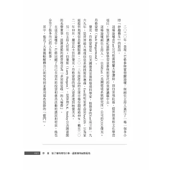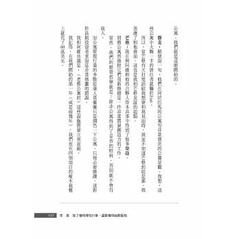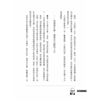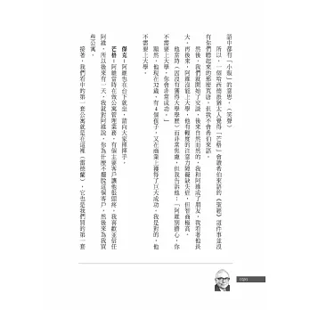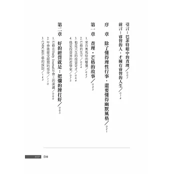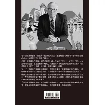 他就是一個如此睿智的人,擁有如此睿智的人生,在他身上我們可以同時看到平凡與不平凡的光點;讓人覺得人生是可以期待、也是可以追求的,而他的幽默與機智,則會讓人感受到生命是如此可愛,生活是可以選擇的。當然我們無法變成芒格第二,但我們卻因此可以活出自己的人生!所以,我們在品味本書之後,也許可以在他的身上,學到一些什麼東西……