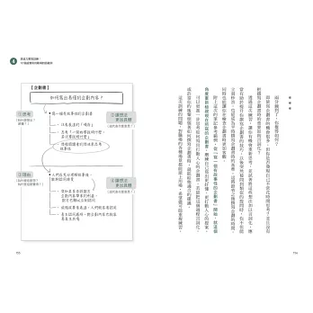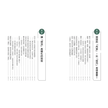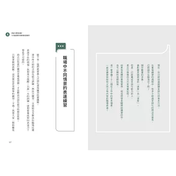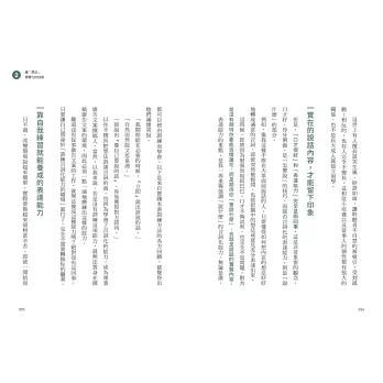 第三章,介紹如何增強言詞化能力的具體書寫練習過程;第四章的「實踐篇」,則是模擬不同的商務場合,並提供具體的訓練範例。