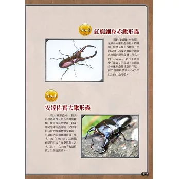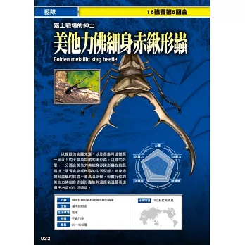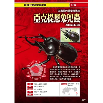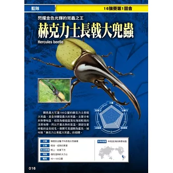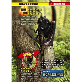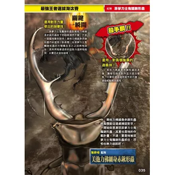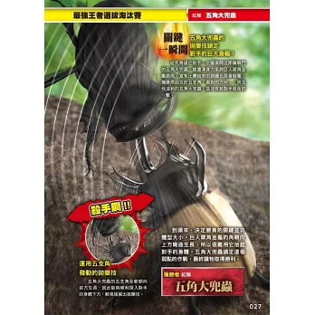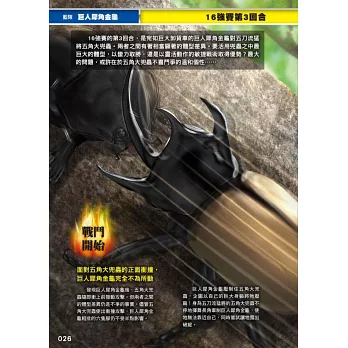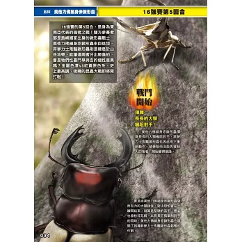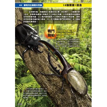 ★鍬形蟲、獨角仙、兜蟲及其他昆蟲在書中進行「模擬戰」,藉由戰鬥過程介紹其生物特質與習性。