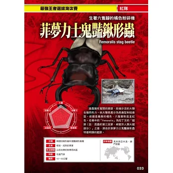 鍬形蟲和兜蟲、獨角仙為了爭奪地盤或雌蟲,會賭上性命一戰。因為,倘若沒有強大到能在戰鬥中獲勝,就無法倖存下來,也就沒有機會留下自己的後代。本書將以淘汰賽的方式,讓棲息在全球的鍬形蟲和兜蟲、獨角仙一較高下,來決定世界上最強大的種類。如果進行一對一的戰鬥,將會出現什麼樣的結果呢?本書會依據各種甲蟲的生態和特性,透過電繪插圖進行模擬戰,同時介紹牠們所擁有的能力。