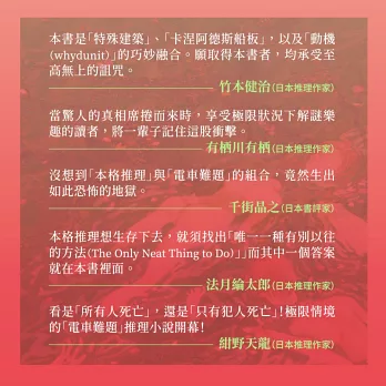 當驚人的真相席捲而來時,享受極限狀況下解謎樂趣的讀者,將一輩子記住這股衝擊。