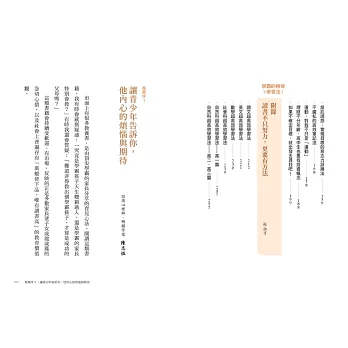 這本書讓我最佩服的地方,在於它是由母子一起合寫的。身為媽媽的瑞君,從父母的角度,寫她如何陪伴孩子走過青春期這段路;身為兒子的祐亨,從孩子的角度,寫他的心路歷程、學習方法,也寫他給父母的心裡話。