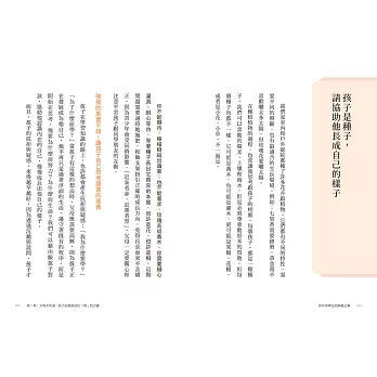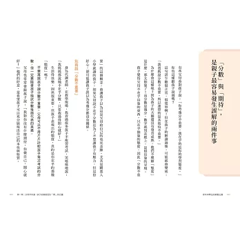 透過這本書的閱讀,讓我們看到親子關係如何像同伴、朋友、教練、陪跑員一般。親子彼此就像一面鏡子,能時時察覺且成長學習。——王意中心理治療所 所長/臨床心理師 王意中
