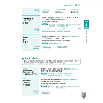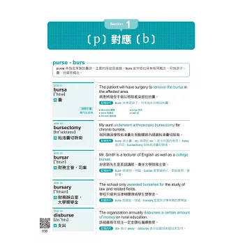 → purse – burs:purse本指皮革製的囊袋,其語音上對應到的字根burs也有相同概念,所以便可衍生出bursa、bursar、reimburse等字根相同的單字組合。