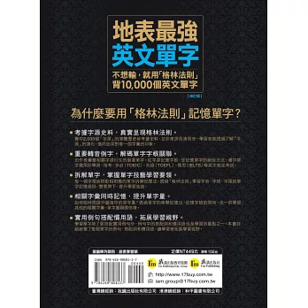 由作者彙整相關字源衍生的重要單字。從字源記憶字根,是記憶單字的絕佳方法。書中單字適用於學測、指考、多益(TOEIC)、托福(TOELF)、雅思(IELTS)等英文檢定考試。