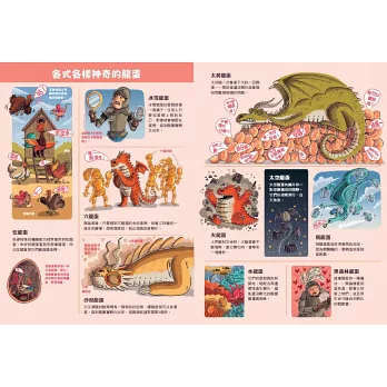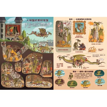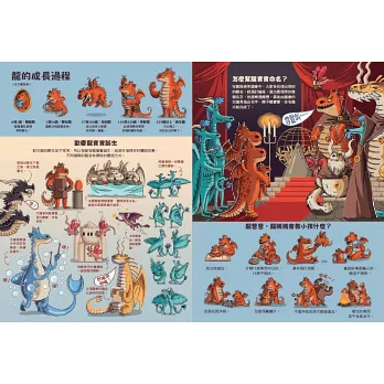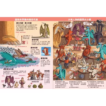 除了以上這些龍的傳說,這本最新的《從前從前……有許多龍?:龍族的傳說與胡說》,更令我大開眼界——詳細介紹隱居各地的十種龍族,以及牠們完整的一生,不同龍蛋的特異魅惑功能,龍蛋從孵化到成年(329歲)的成長過程;龍寶寶在「酷龍學院」學習的課程、各自愛吃的食物、體型不同的龍所衍生的儀態缺陷和常見疾病、龍族退休養老集中生活的小島……種種聽來嘖嘖稱奇,卻童話十足的可愛「胡說」!