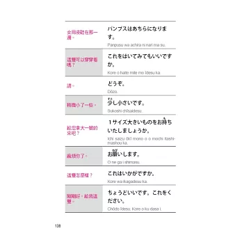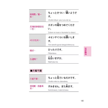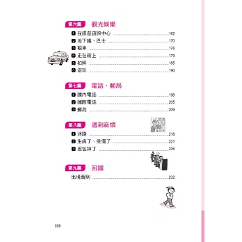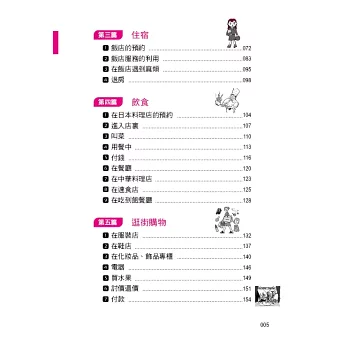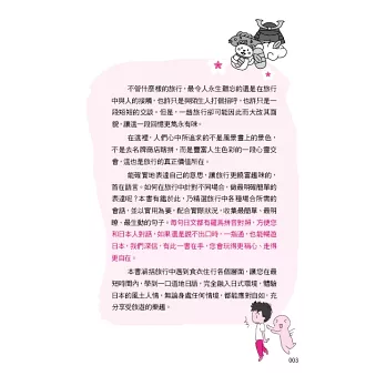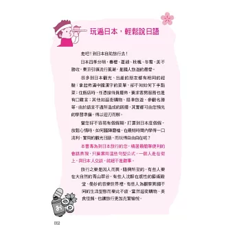 能確實地表達自己的意思,讓旅行更饒富趣味的, 首在語言。如何在旅行中針對不同場合,做最明確簡單的表達呢?本書有鑑於此,乃精選旅行中各種場合所需的會話,並以實用為要,配合實際狀況,收集最簡單、最明瞭、最生動的句子。每句日文都有羅馬拼音對照,方便您和日本人對話,如果還是說不出口時,用手比,也能暢遊日本,我們深信,有此一書在手,您會玩得更稱心、走得更自在。