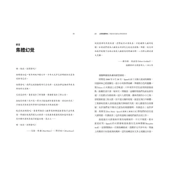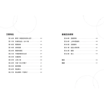 仰望星空的企業家為了建立太空新經濟而展開的瘋狂競賽,是我們這個時代最能激勵人心的故事之一。范思以栩栩如生、妙筆生花的文字刻畫各式各樣的人物,描繪他們的野心和理想,他們不僅改變我們的世界,也改變我們的天空。這是下一個尖端科技,而范斯把它化成了探險故事。——華特.艾薩克森(Walter Isaacson),《賈伯斯傳》、《馬斯克傳》作者