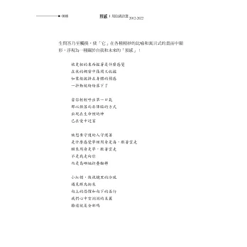 能完成的一個儀式。「儀式感」是我在欣祺詩中反覆感受到的關鍵詞,更多的時候,她在詩中舉行的儀式,是結束式、是悼念和輓歌。〈密林〉是欣祺在祖父去世之後寫的一首詩,我清晰記得她在捷運上跟我講述親人離世以及家人病痛給她的影響時,神情裡仍有鮮活的痛苦。有時,越是血脈相連的家人,越無法通過直接的傾訴和抒情來溝通彼此,對他們的愛只能以畫面、影像的方式深深鑿刻在記憶中,撕扯又恢復的家庭關係永遠是一則掩埋又破土的自我成長的寓言。在〈密林〉這首詩裡,祖父、父親與「我」的關係被呈現一個在梅雨時節的密林之中一前一後行走的狀態,整體的低氣壓和距離感並沒有讓「我」與父輩形成簡單的對峙關係,在對祖父的紀念儀式中,「我」與父親似乎也可以「交換位置」: