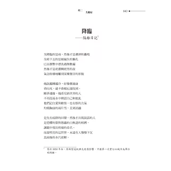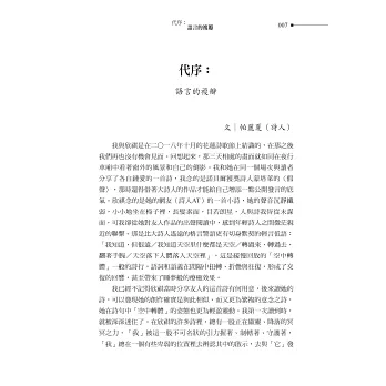 我從和她在花蓮分別的那刻起就一直期盼著。直到我們行程快結束的前一晚,她才敲了敲我的房門,很鄭重地告訴我她願意加入我的詩社。我笑道,其實根本不存在什麼詩社,但因為她答應了,以後也就有了。臨別時我送了她一本書,在扉頁寫著:「我在語言中遭遇你、辨認你,而我卻有語言無法表達的喜悅。」如今讀她的詩集,更是如此。