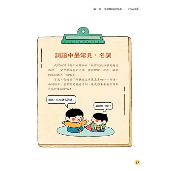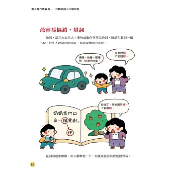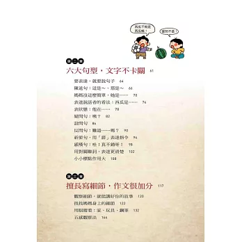 此外,文章貴在觀察有新意、運用各種修辭法,很多人經常卡在這一關,但第四章用有趣的文章和圖像,介紹比喻、擬人、誇飾、對比,既視感強烈,就算是平常不愛寫作的孩子,也可以一頁一頁讀下去。