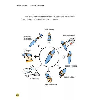 另外,本書透過圖解,教導孩子觀察大方向和小細節,例如觀察自己的媽媽、拆解一支鋼筆,啟發他們對事物的細緻觀察和思考。而在介紹修辭法的時候,更補充了許多寫作小技巧,讓孩子們的觀念更加扎實。
