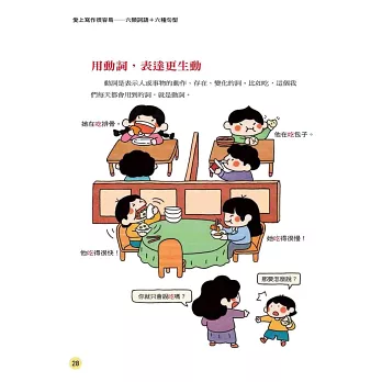 以我們每天都會用到的動詞來說,像是「吃」,可以用:舔、啃、咬、吮、細嚼慢嚥、狼吞虎嚥。書中統整的這些詞彙,寫作時拿出來翻翻、想想,馬上就有靈感。