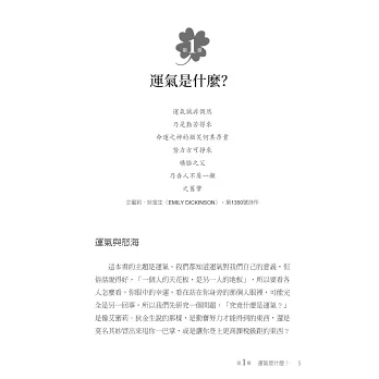 2.好運其實沒那麼好?厄運其實沒那麼壞?例如:「從危險中逃過一劫」可以說是好運;「只差一個號碼就可以中樂透」可以說是帶點厄運。運氣與你想像的大不相同,從心理學的角度重新檢視運氣,你會發現運氣沒那麼簡單!